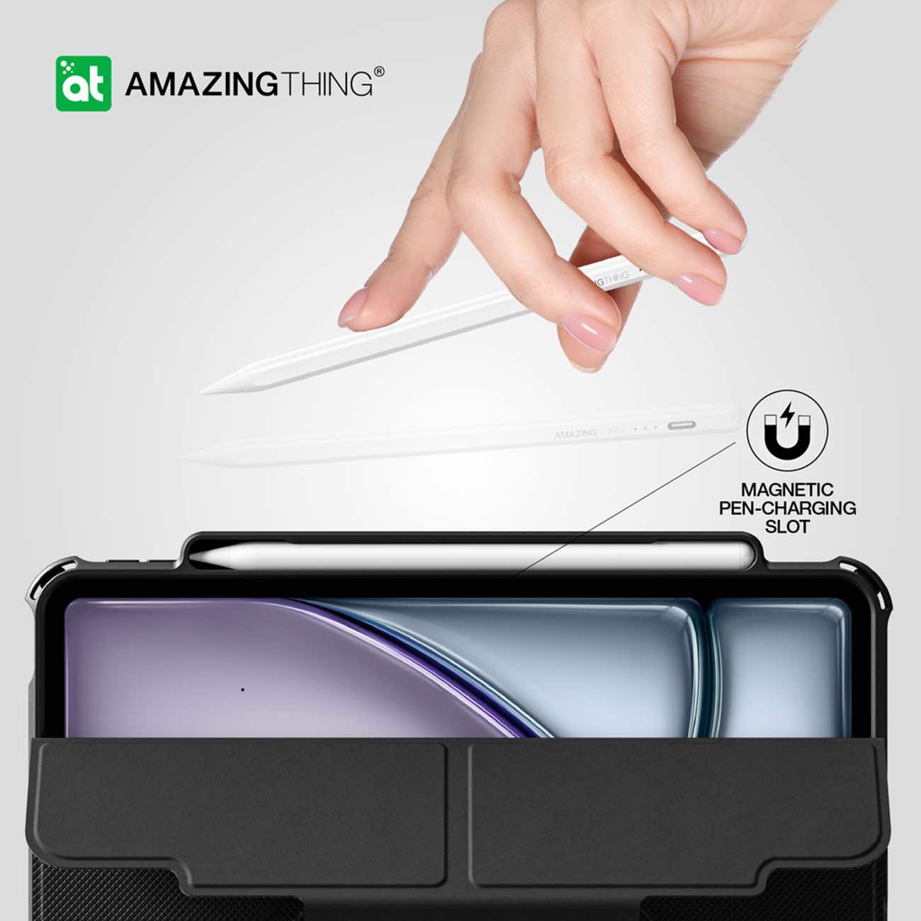 Includes a slot for storing and magnetically charging the Apple Pencil .. preventing it from getting lost.