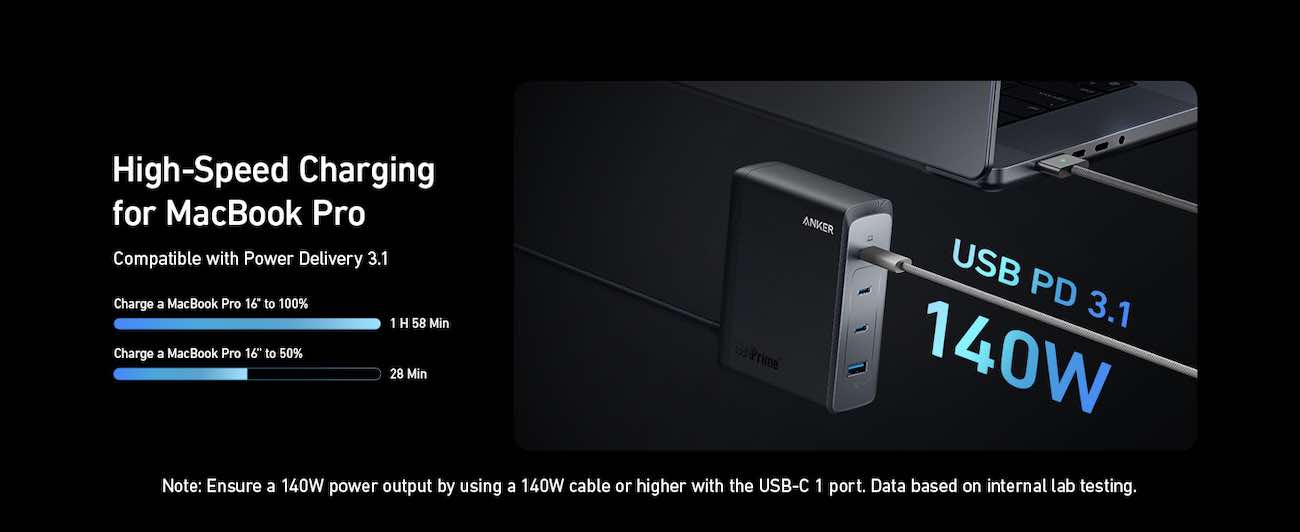 The Type-C port on top provides 140 watts, and the 3 ports below provide 100 watts each. That adds up to 240 watts.