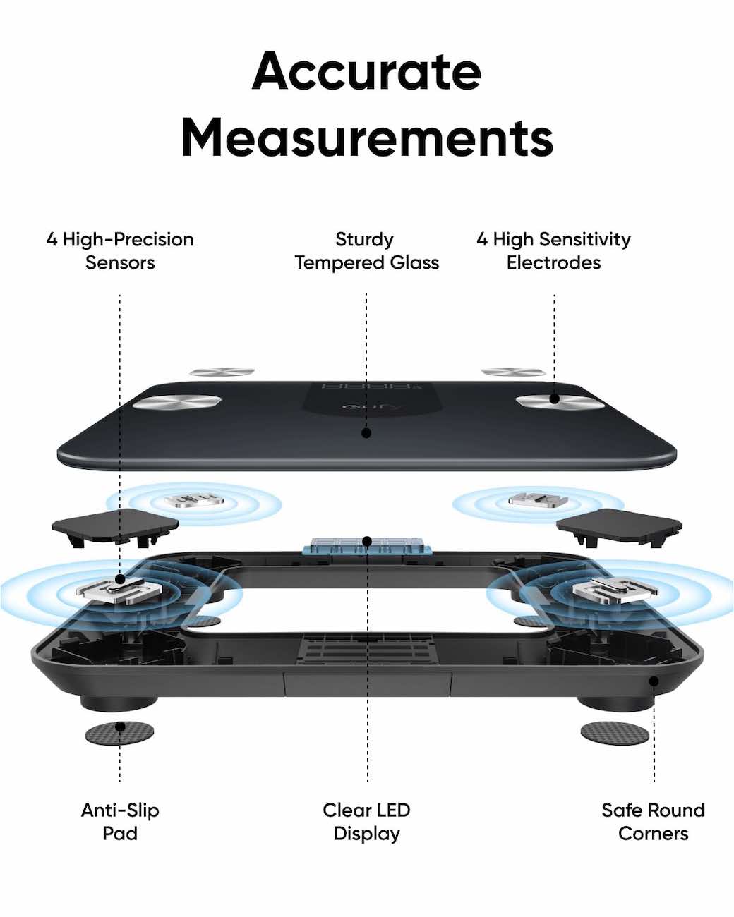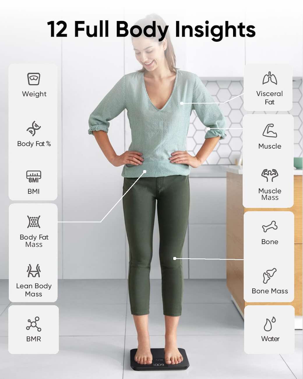 Provides 12 different body measurements including weight .. body fat .. BMI .. and more.