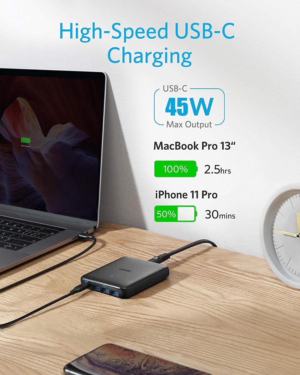 Charge 4 Devices Simultaneously: A PowerIQ 3.0 enabled USB-C port pumps out a max 45W output to charge virtually any USB-C device at top speed, while 3 USB ports share a total of 20W to provide optimized charging for mobile devices.
