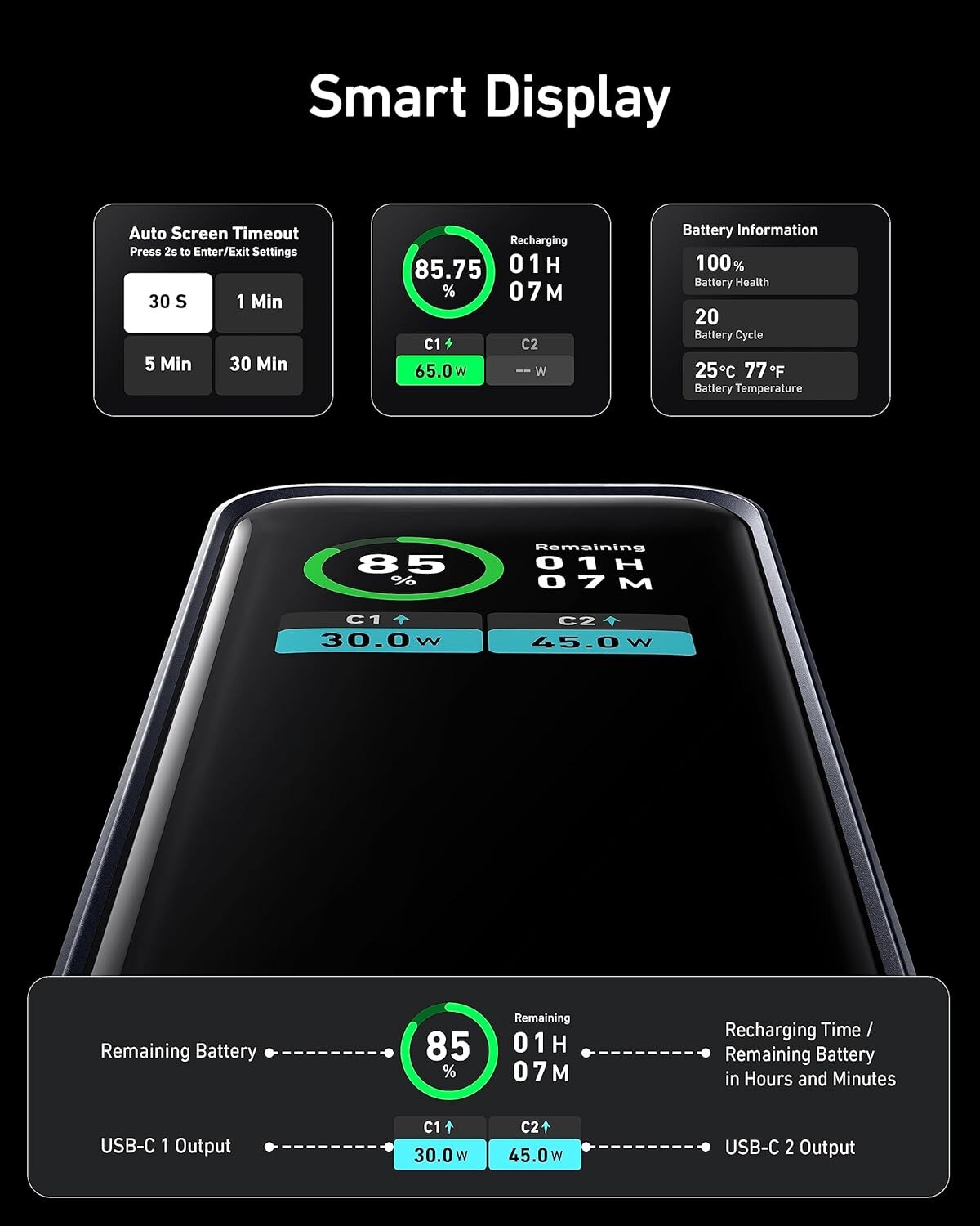 Includes a screen that displays information about consumption, charging speed, and remaining power.