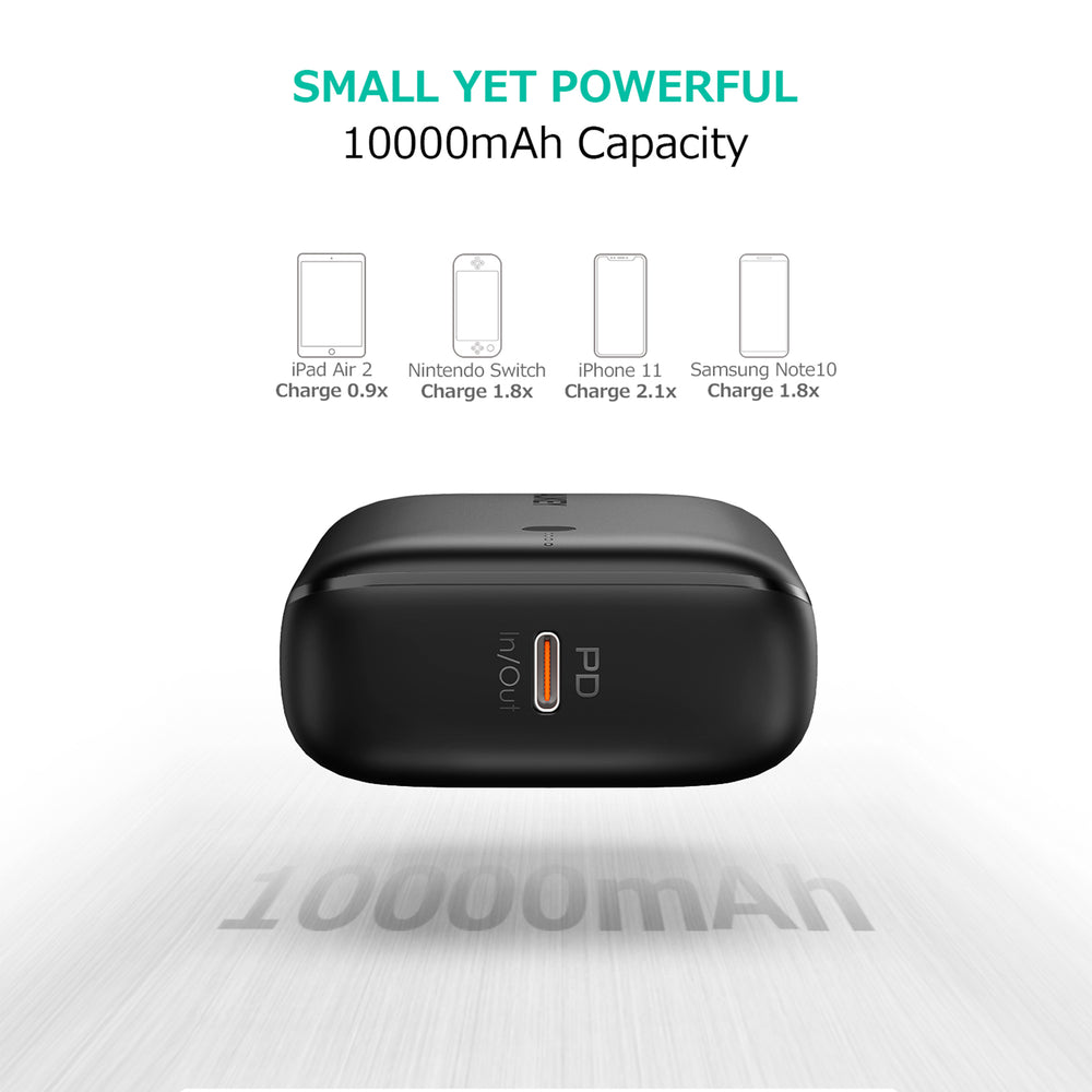 - Delicate design One of the smallest and lightest 10,000mAh portable charger. It’s compact and smooth design fits comfortably into the palm of your hand and the minimalist LED indicator shows the remaining power at a glance