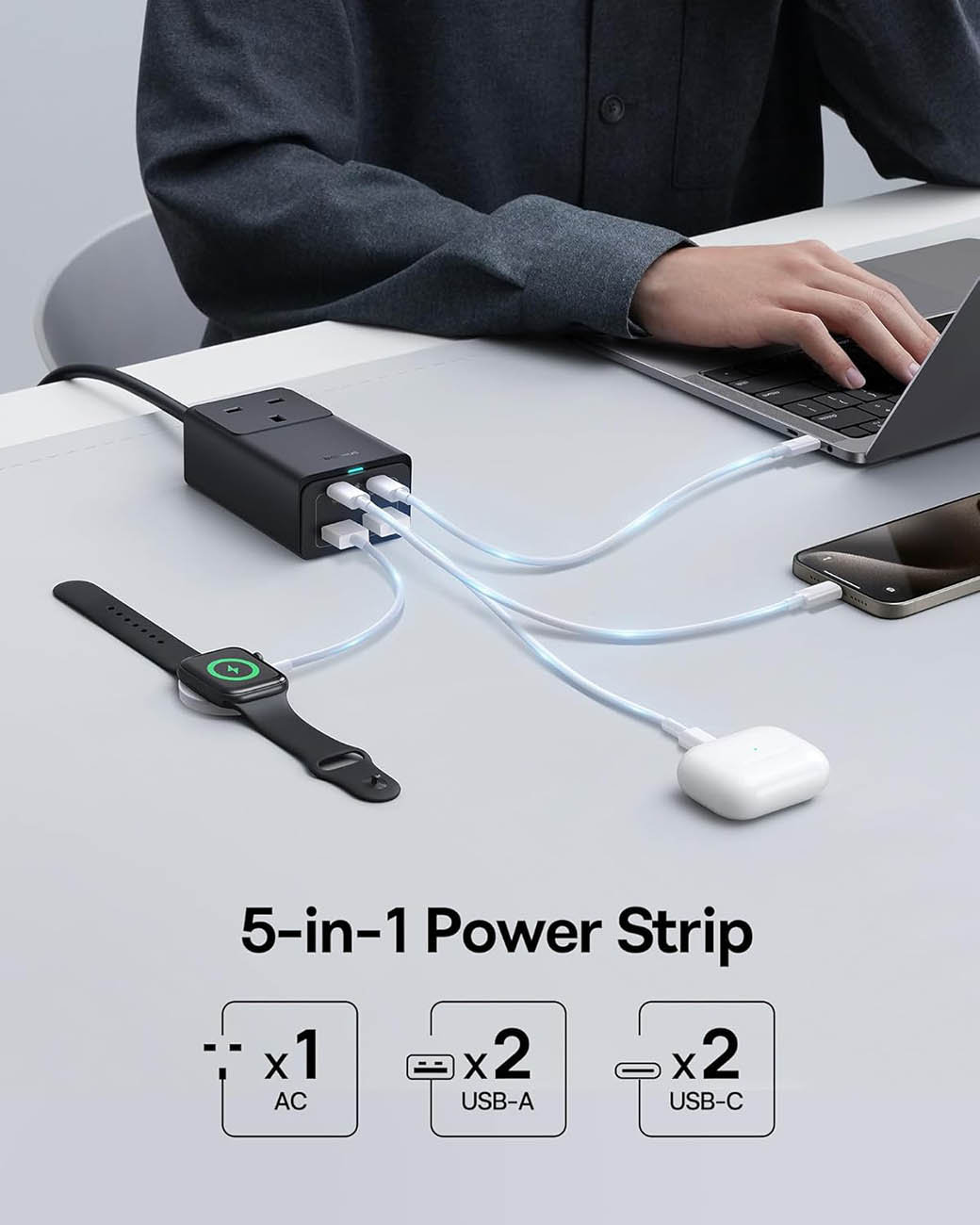 Provides 5 versatile ports: 1 AC outlet .. 2 Type-C ports .. and 2 USB ports.