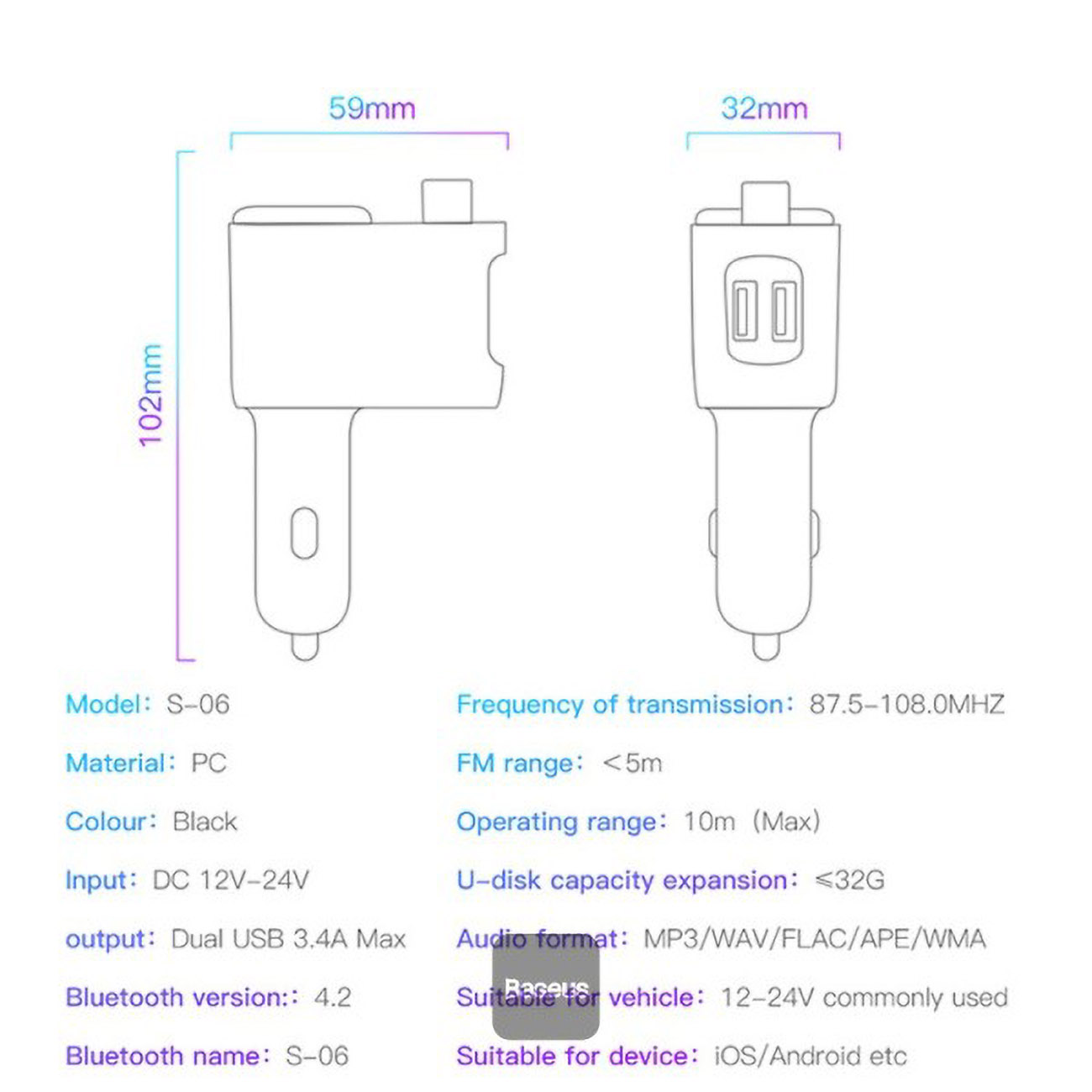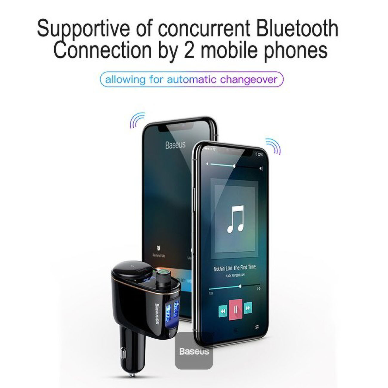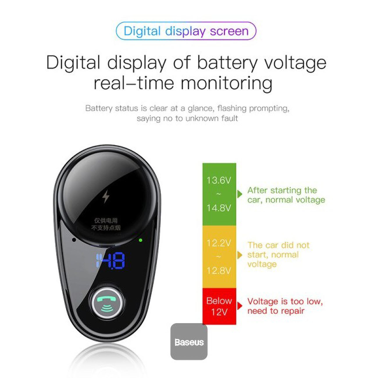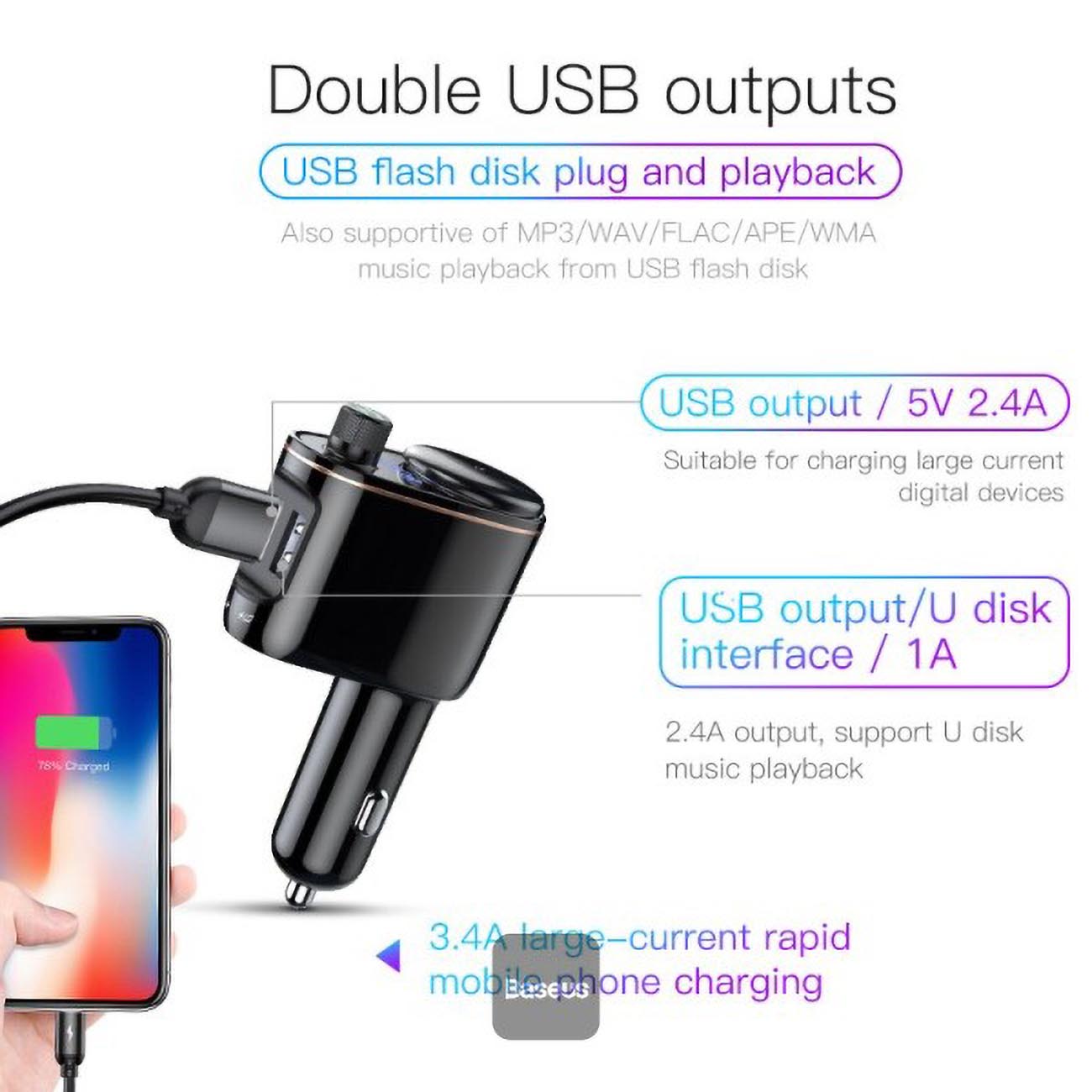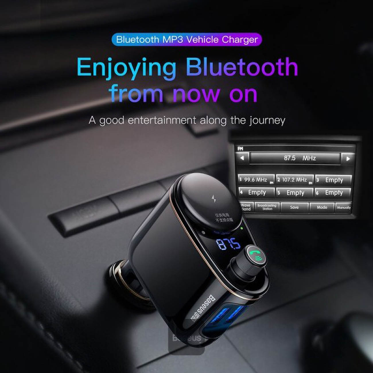 Baseus car charger with FM transmitter and Bluetooth.