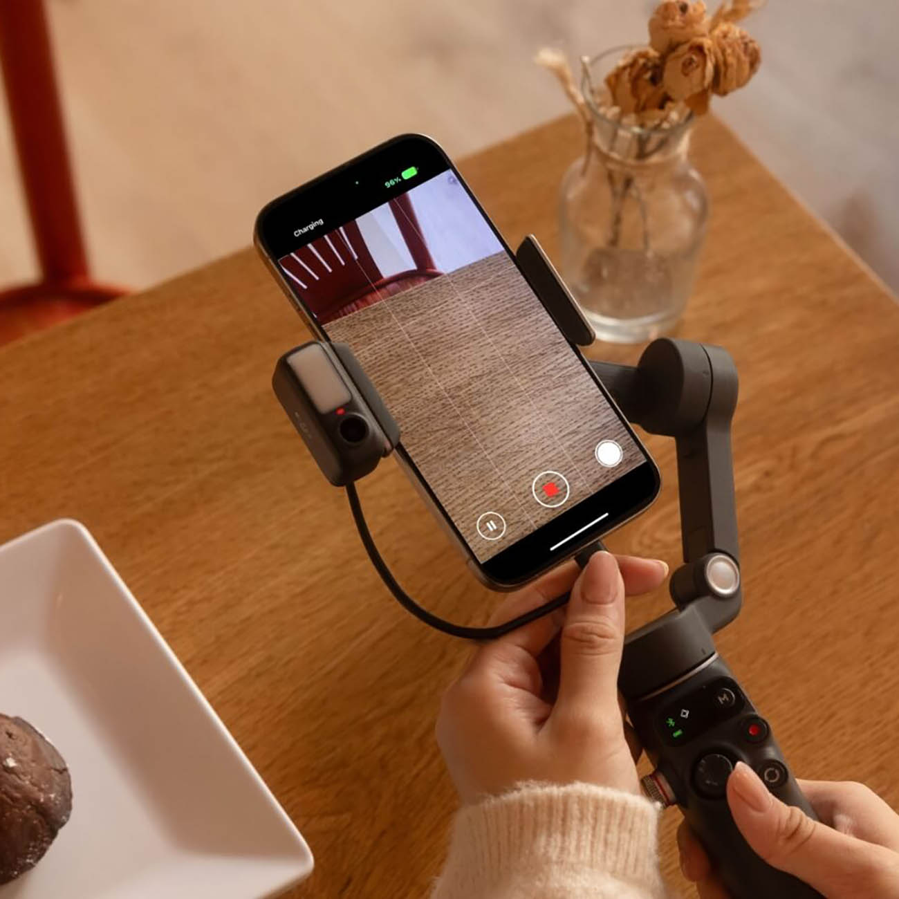 Comes with a built-in tripod for easy video recording – unlike the Osmo 6 .. which required a separate tripod attachment.