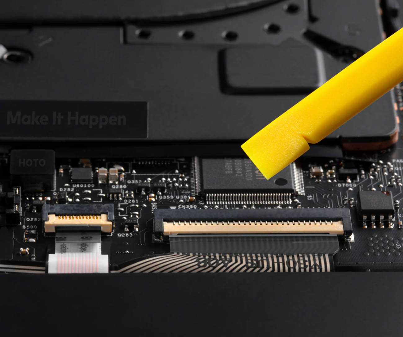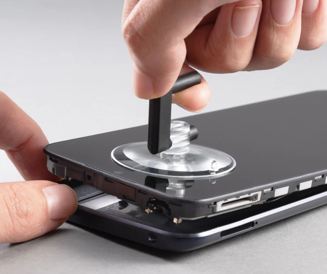 Multiple opening tools (spudgers) .. straight and curved tweezers .. and a phone suction cup.