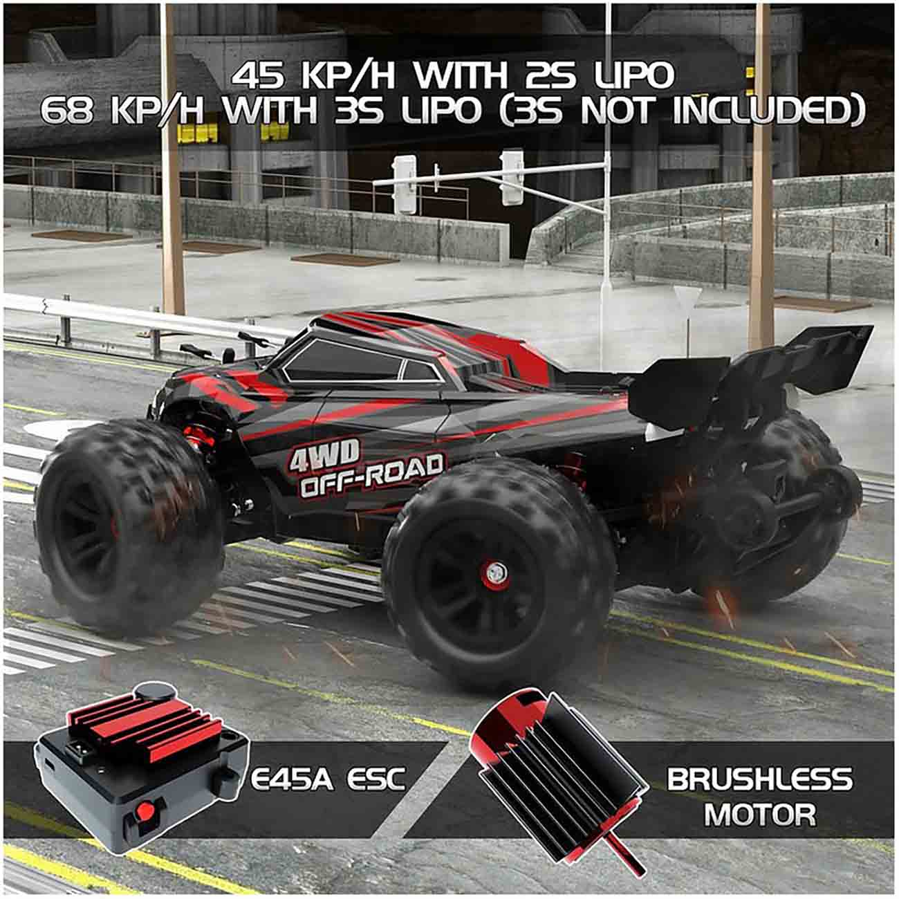 Can reach speeds of up to 45 km/h with a 2S battery .. and up to 68 km/h with a 3S battery.