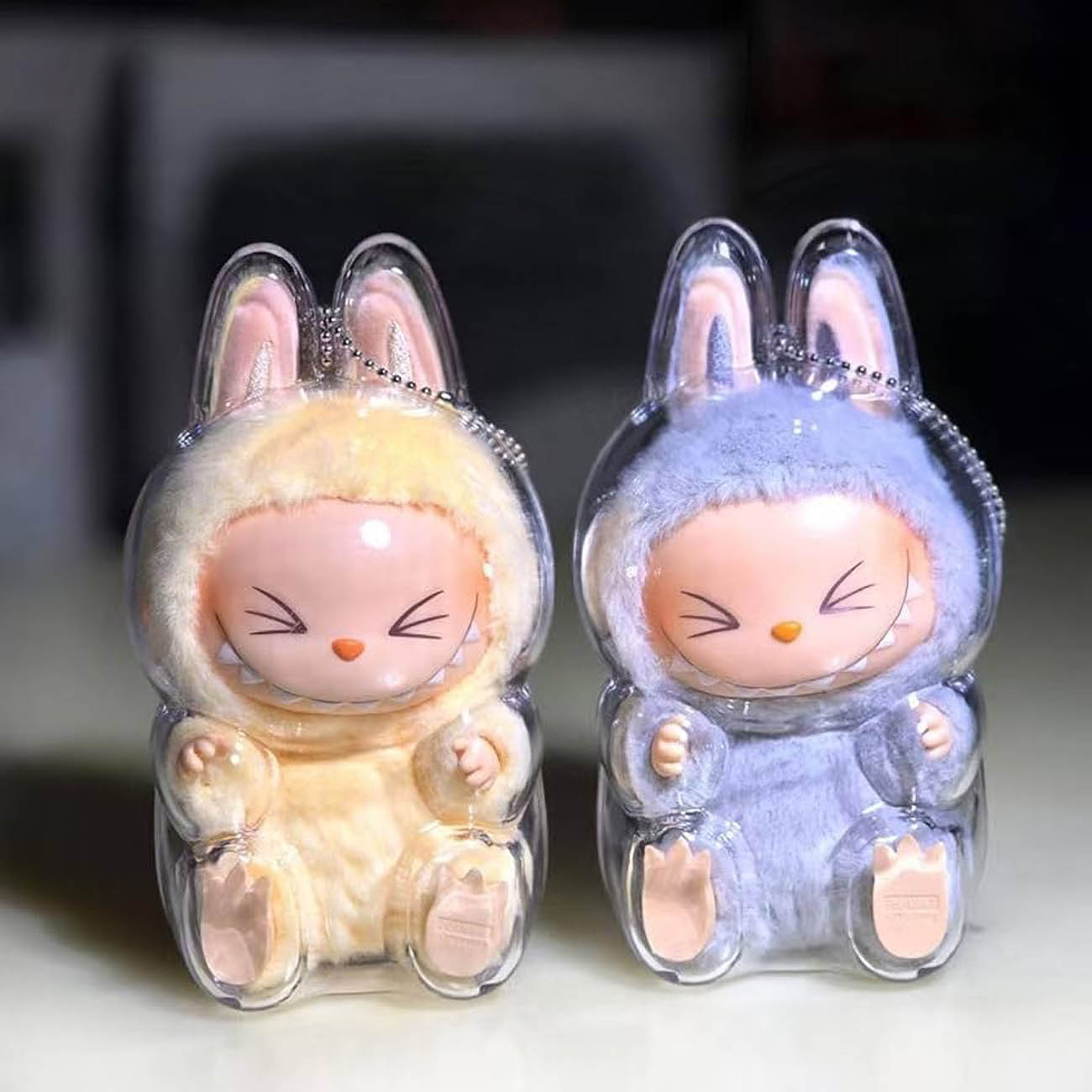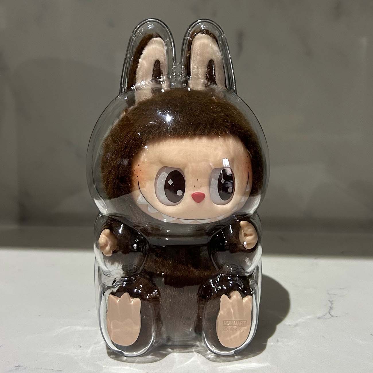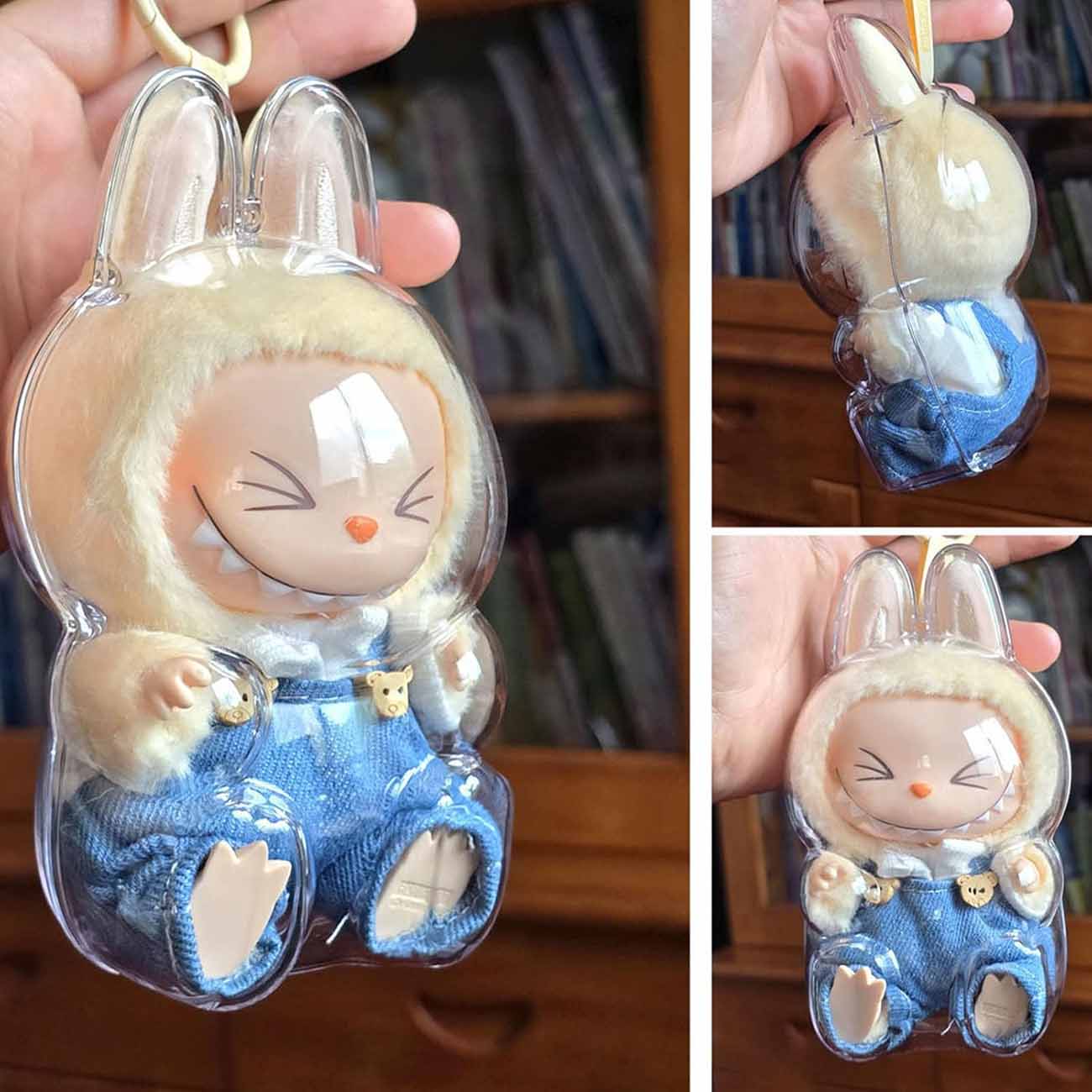 Transparent protective case for Labubu toy.