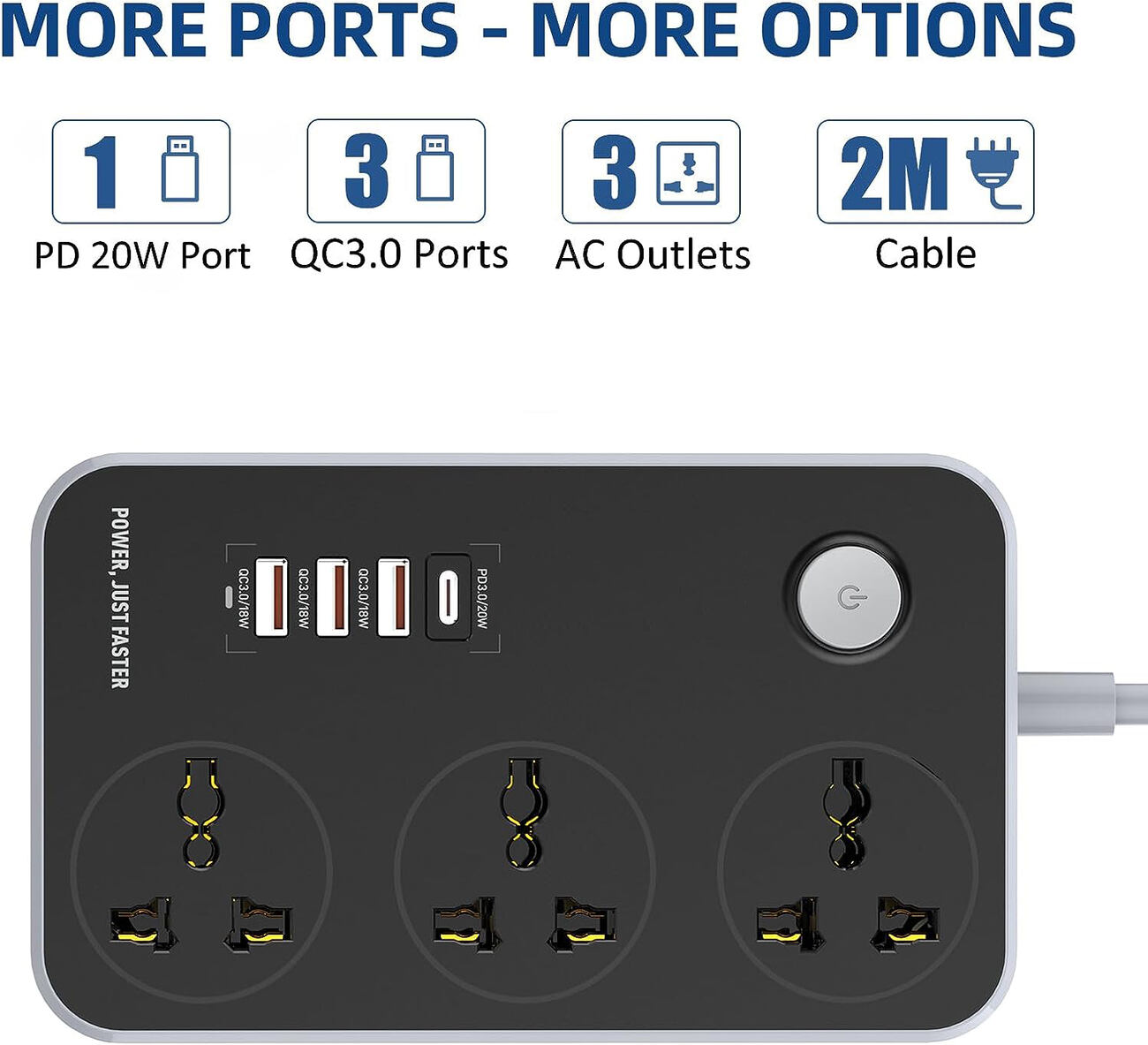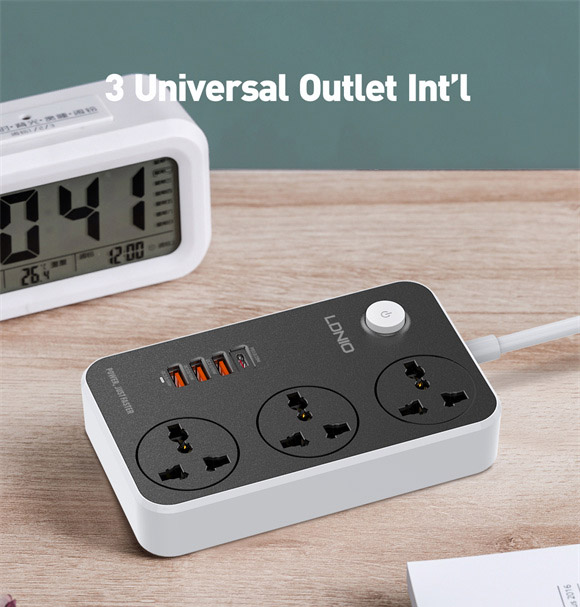 A useful adapter with 3 international outlets, meaning it's a power strip that can accommodate various plug types.