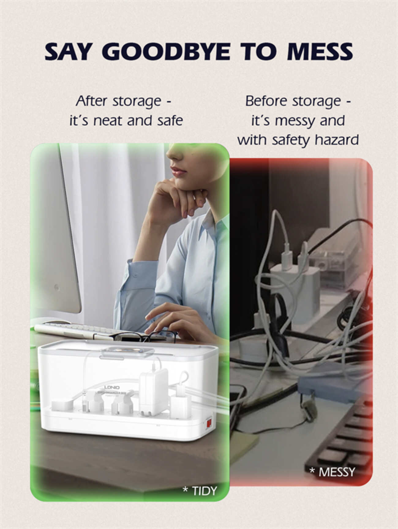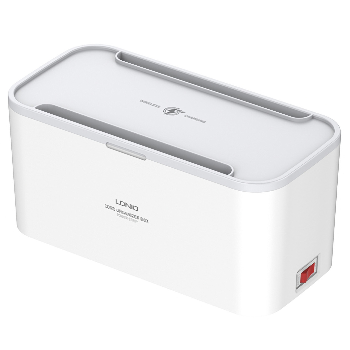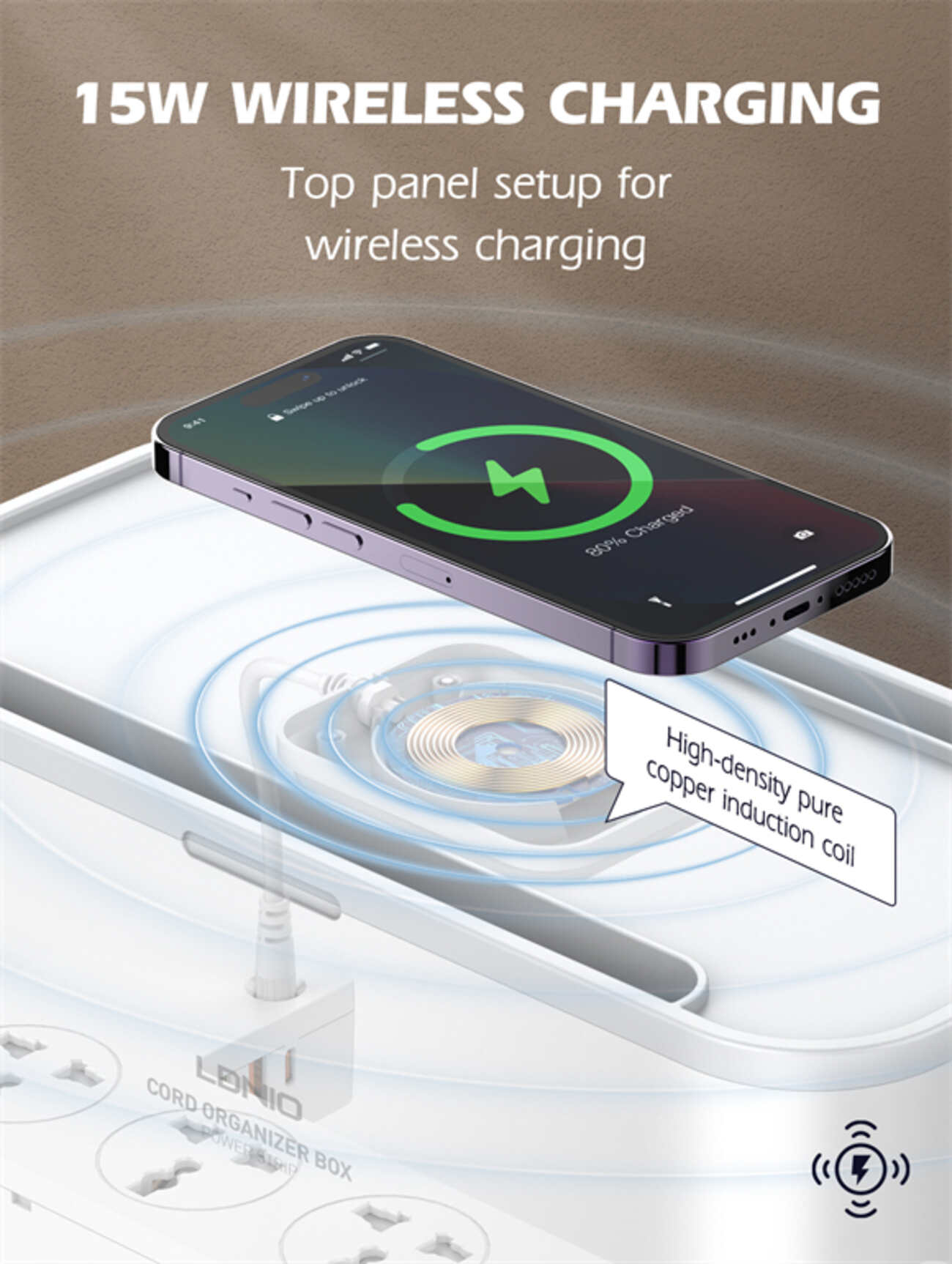 On top, there's a wireless charger where you can charge your phone, earbuds, or any device with wireless charging capability.