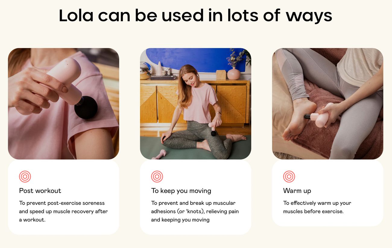 Lola is great for muscle warm-up, post exercise recovery, tension and stiffness relief, muscular adhesion, and lets you relax and unwind after a long day of work.