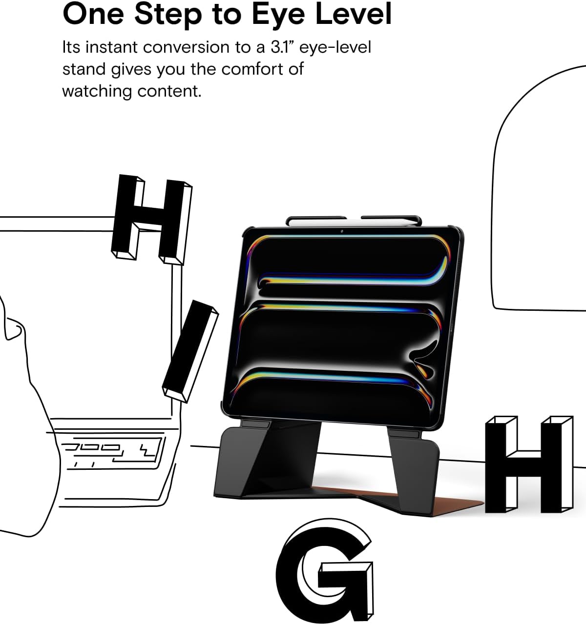 Elevates your iPad to eye level for a more comfortable and ergonomic experience.