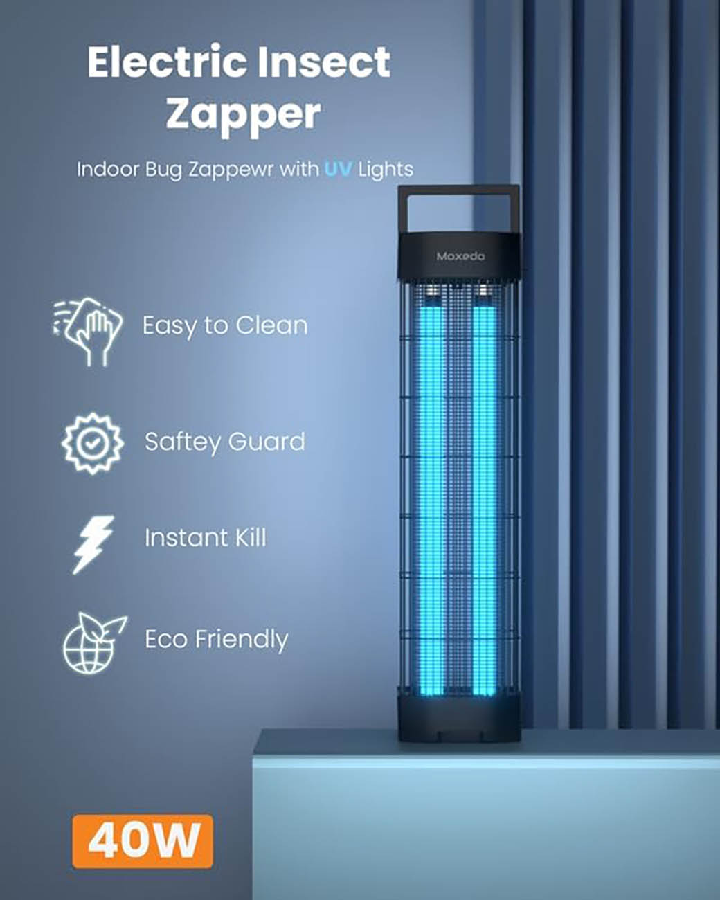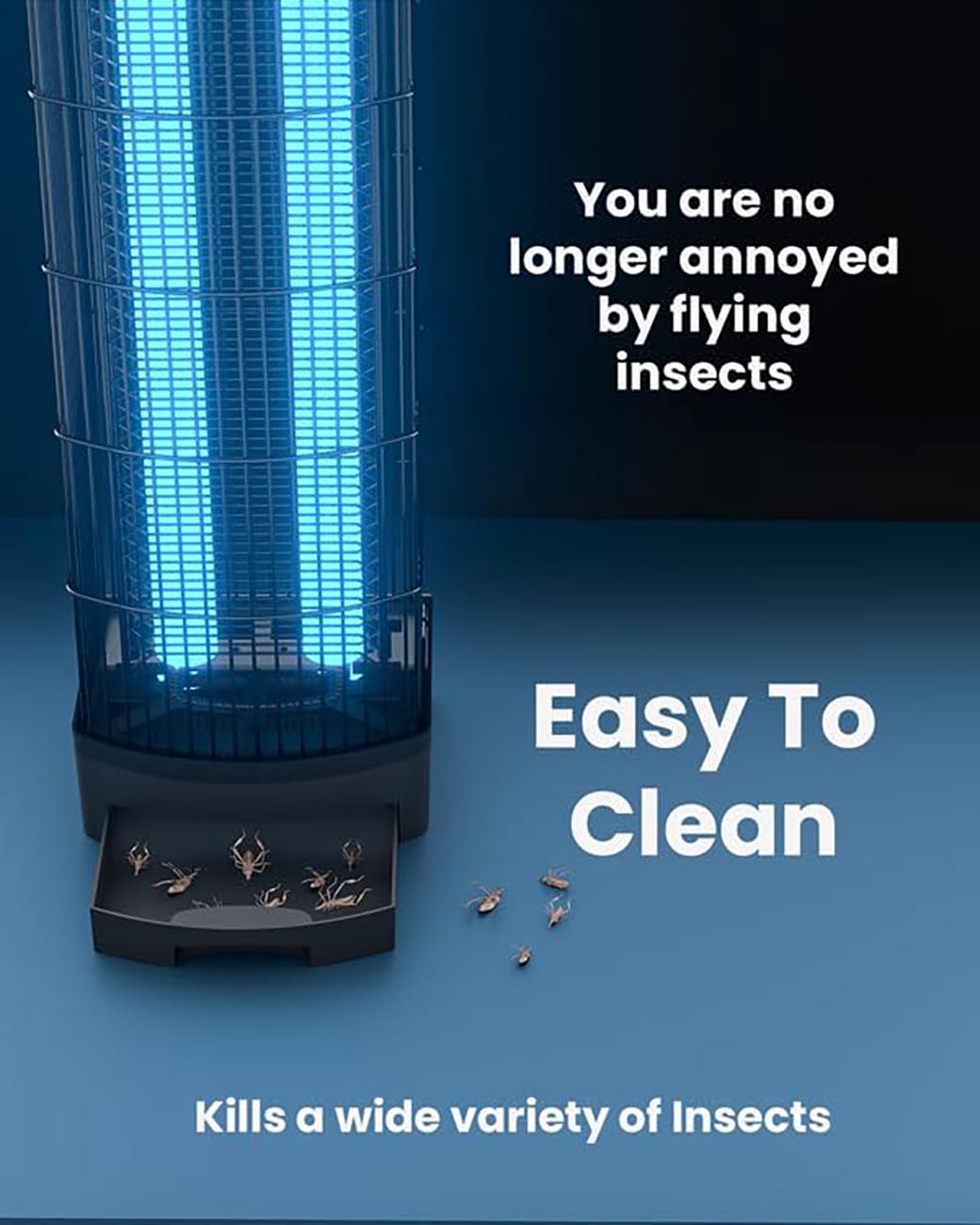 Features LED lamps to attract insects from long distances and eliminate them.