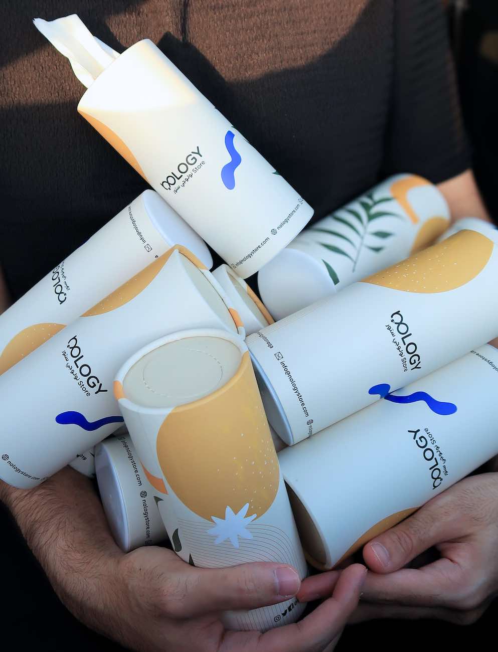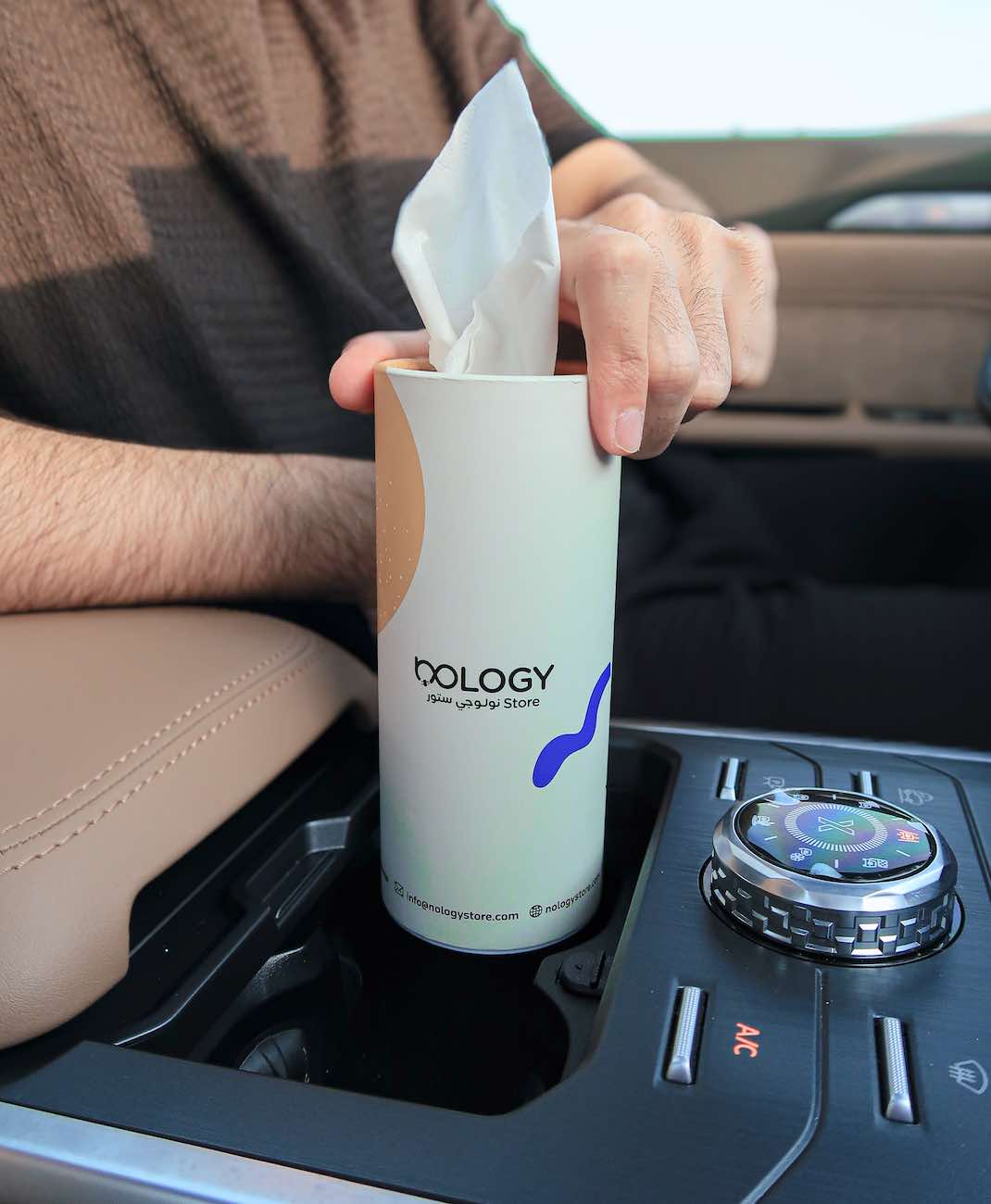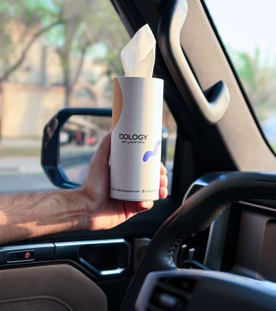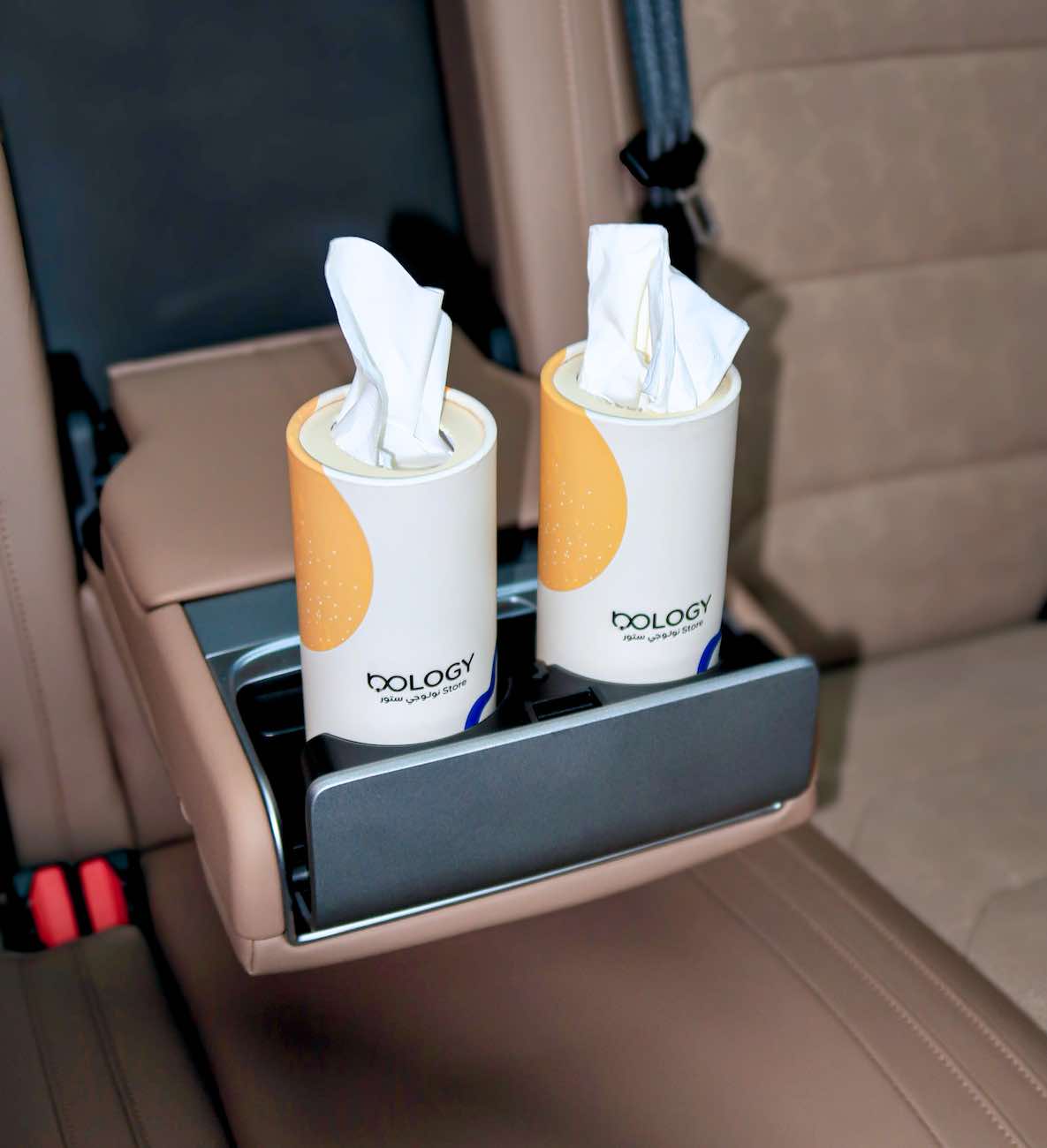 Cylindrical tissue box designed to fit in the car's cup holder .. containing 50 double-ply tissues.