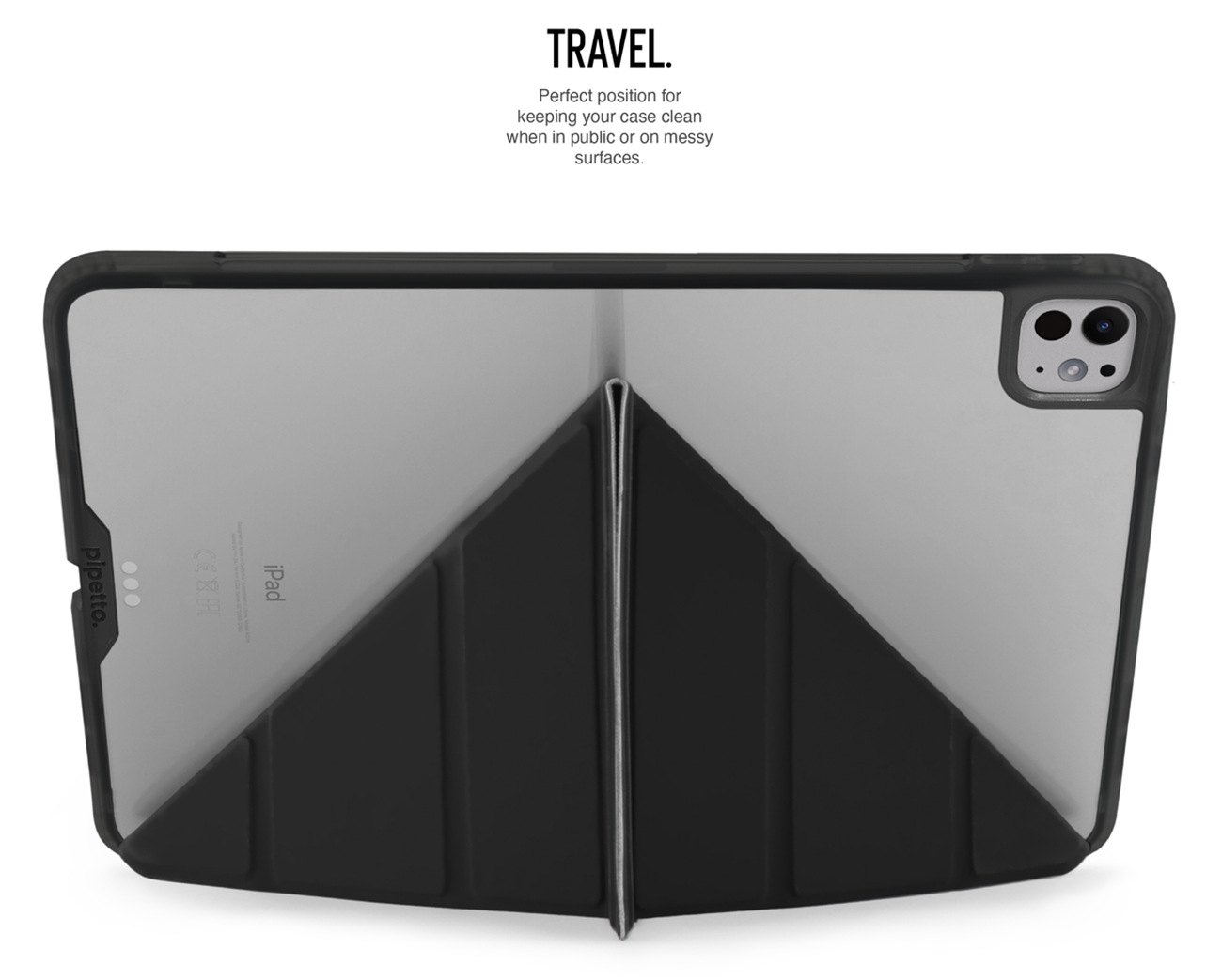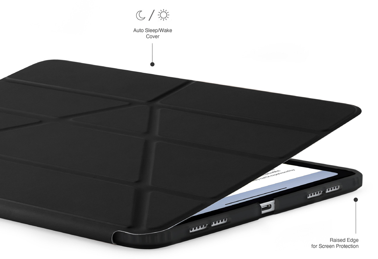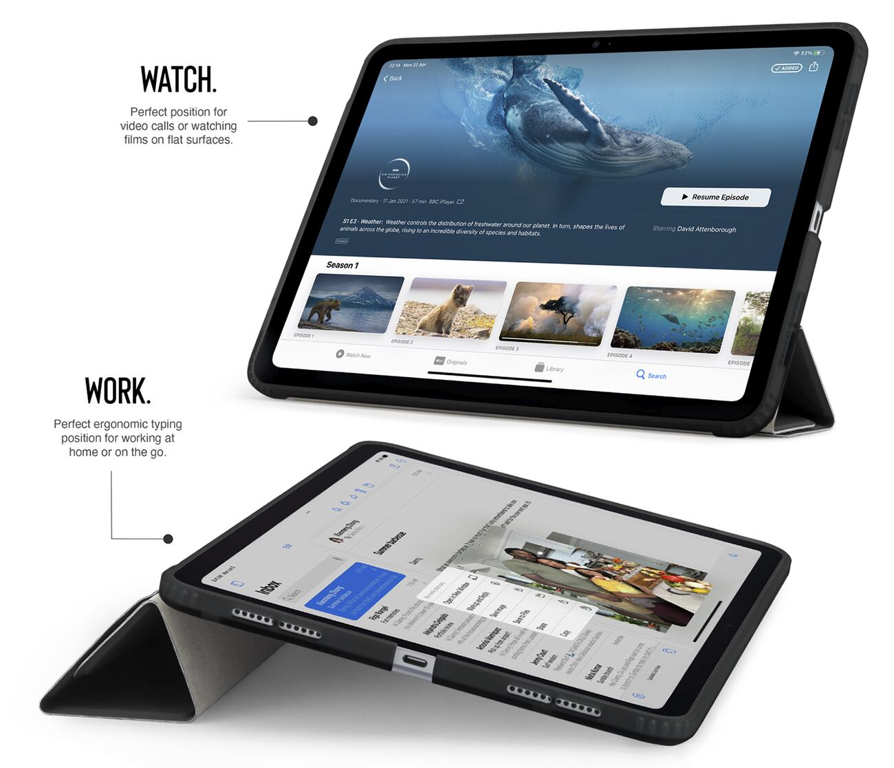 The front cover can be folded to position the iPad in portrait or landscape mode at multiple angles for your convenience.