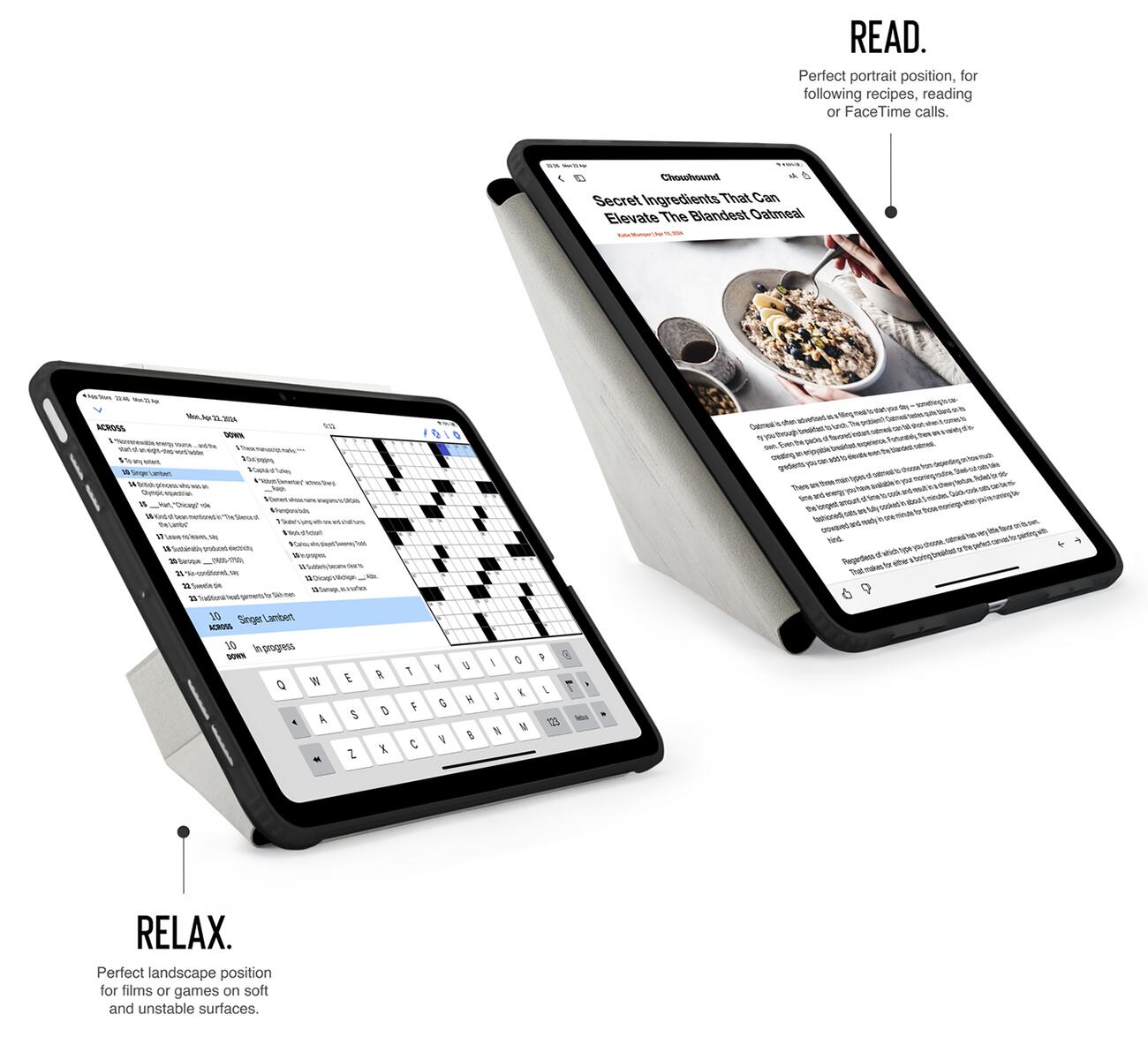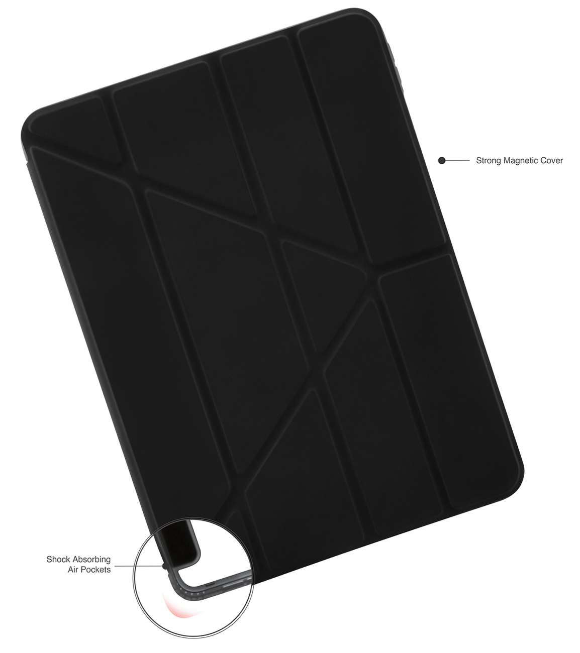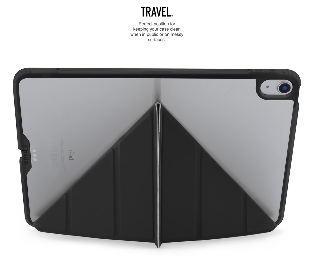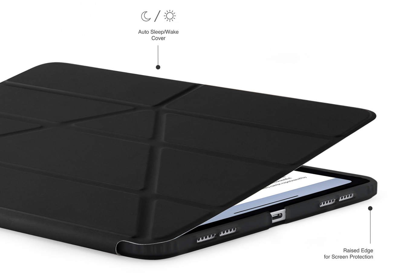 The front cover can be folded to position the iPad vertically or horizontally at multiple angles to suit your usage.