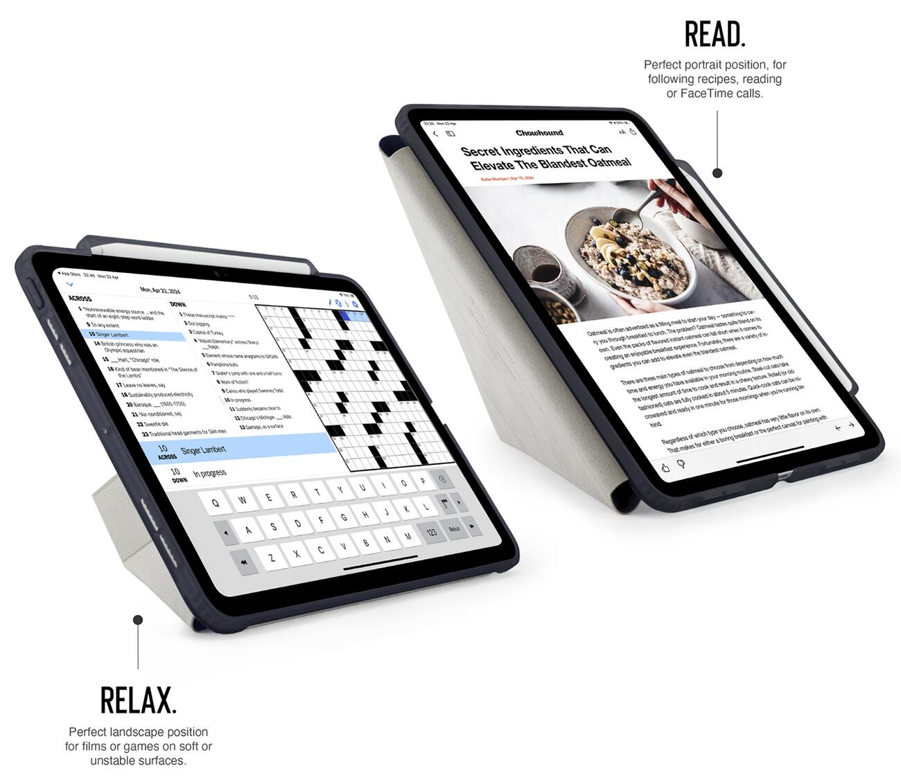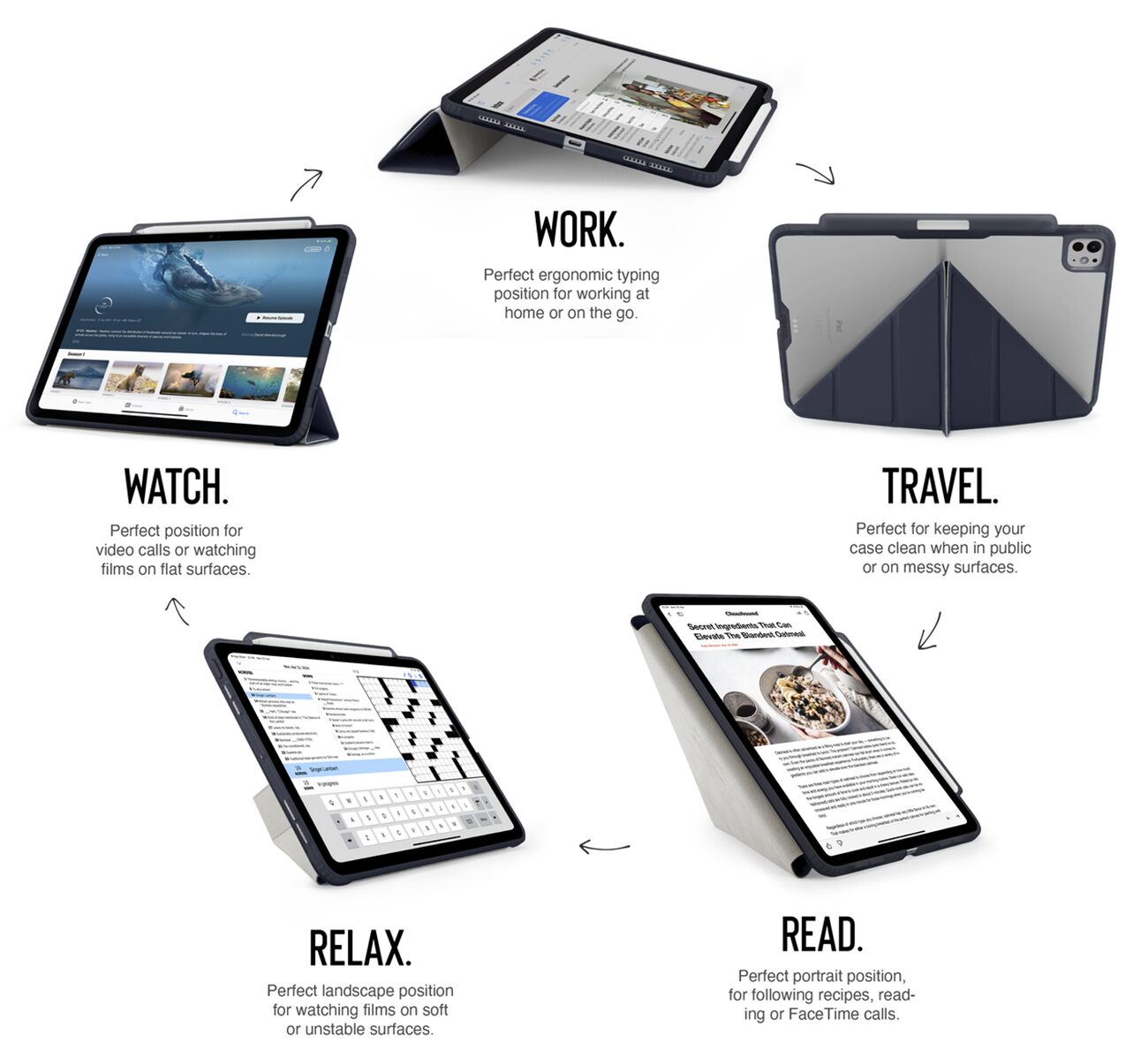 The front cover can be folded to position the iPad in portrait or landscape mode at multiple angles for your convenience.