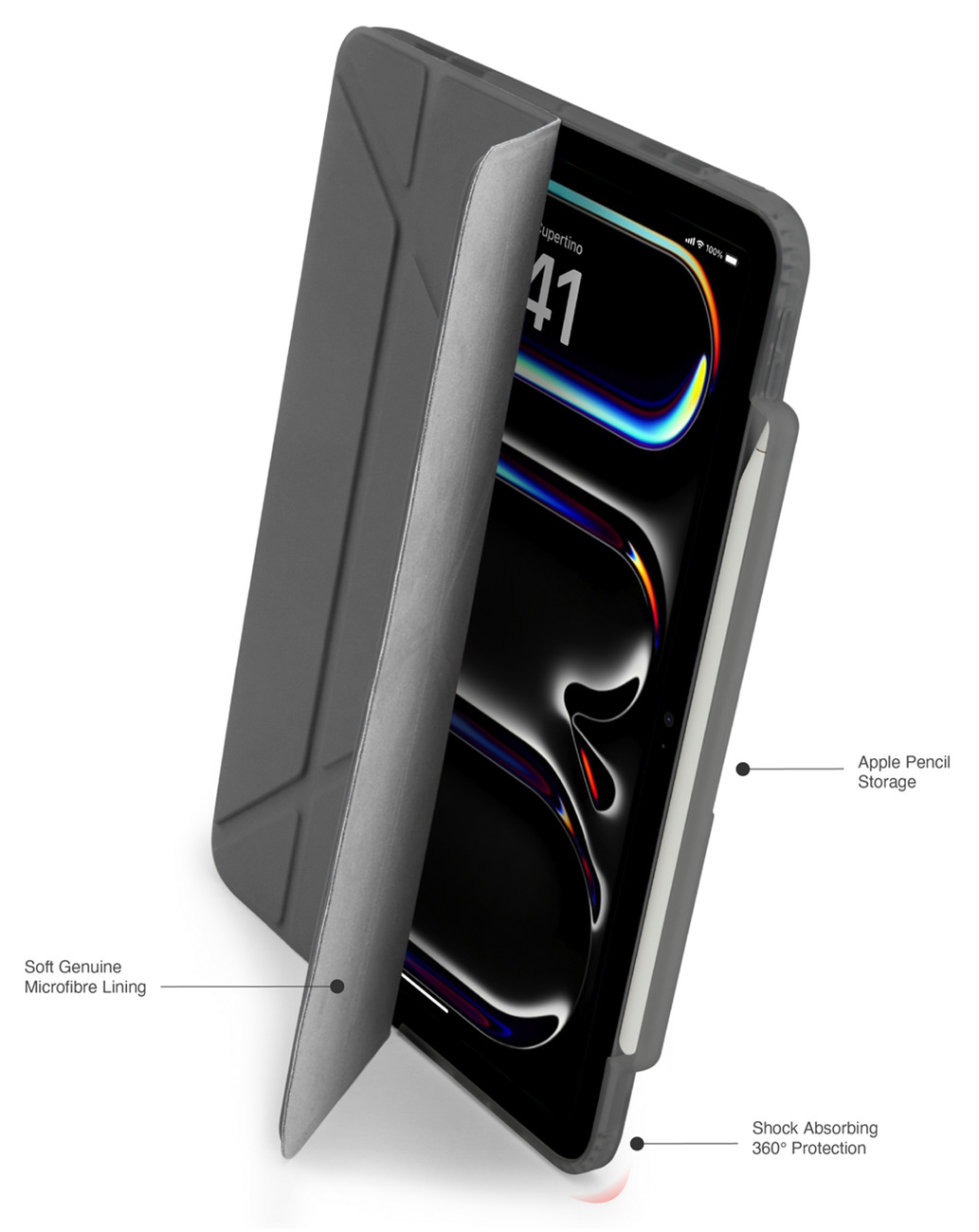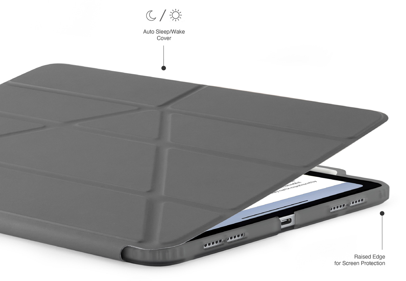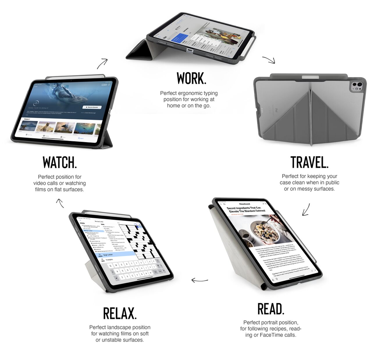 The front cover can be folded to position the iPad vertically or horizontally at multiple angles to suit your usage.