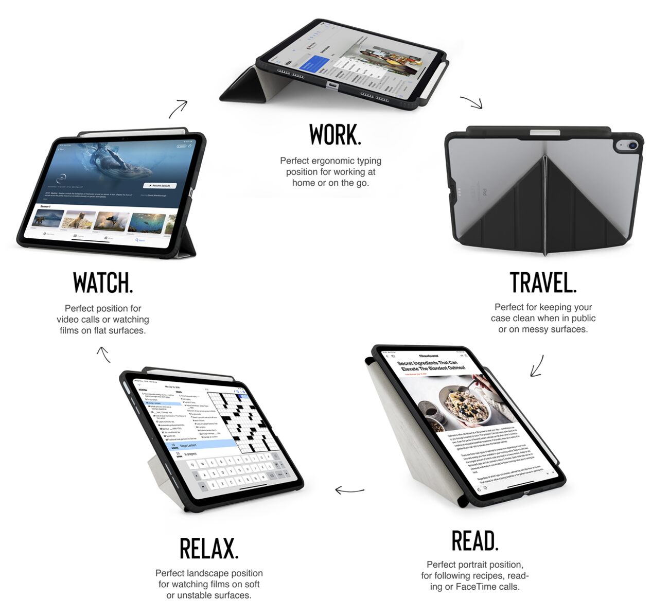 The front cover can be folded to position the iPad in portrait or landscape mode at multiple angles for your convenience.