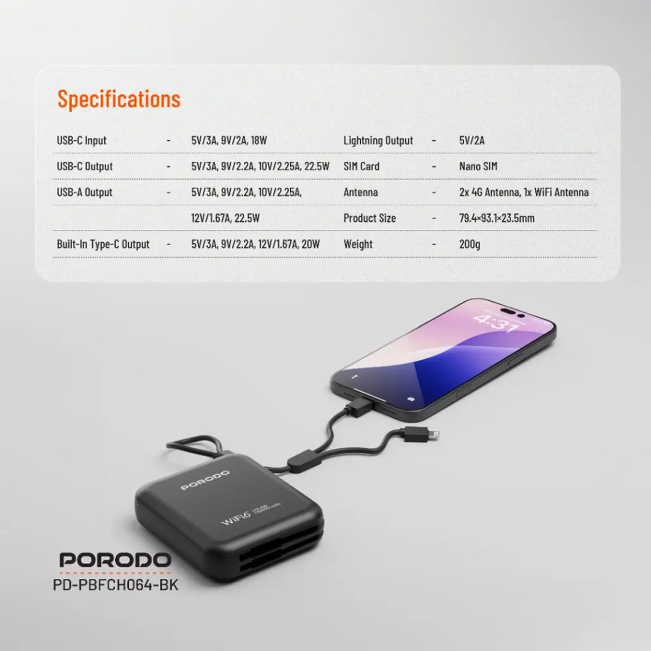 Portable 4G LTE router from Porodo with a built-in battery.