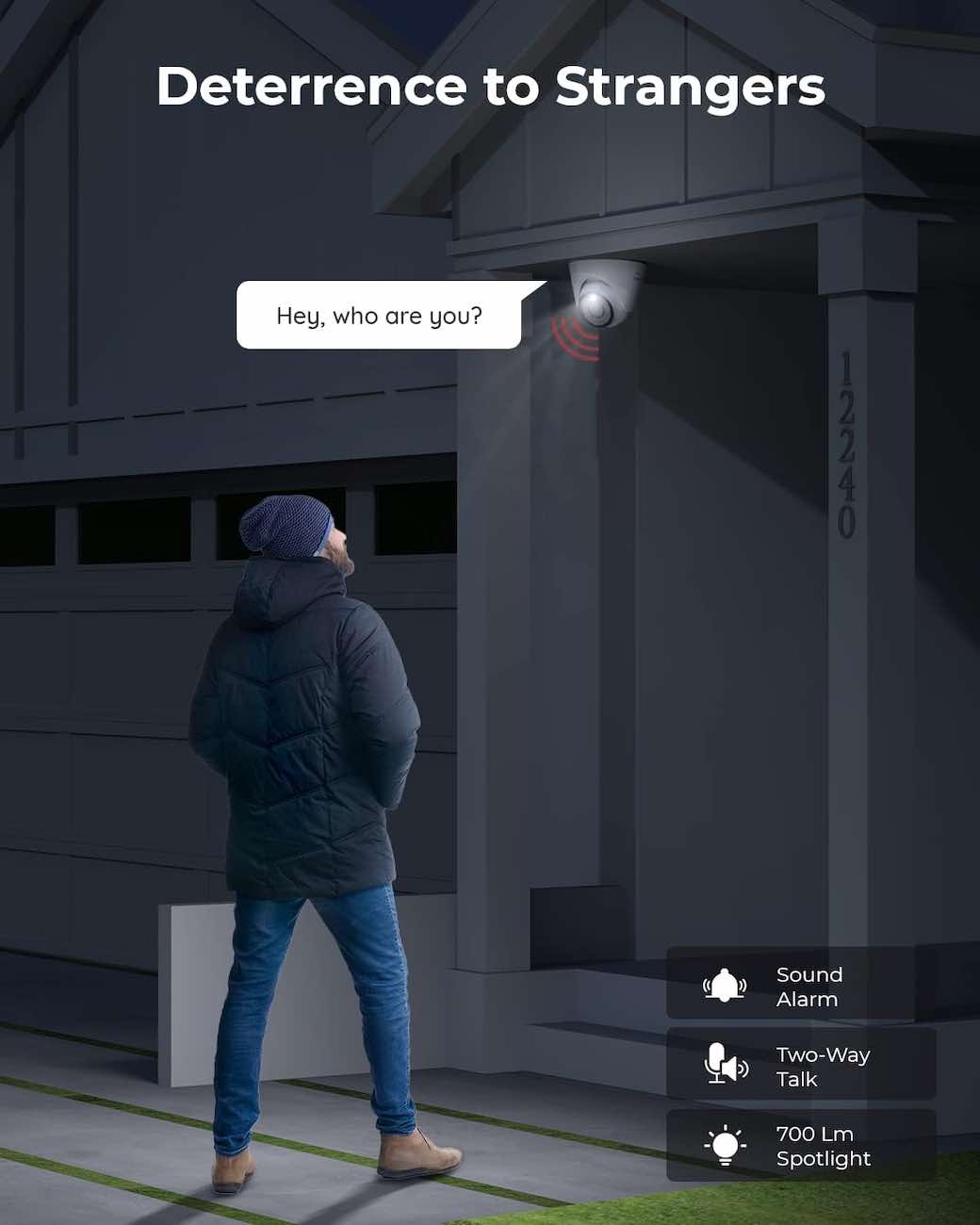 Includes a sound alarm feature that triggers light and sound effects to deter unwanted visitors.