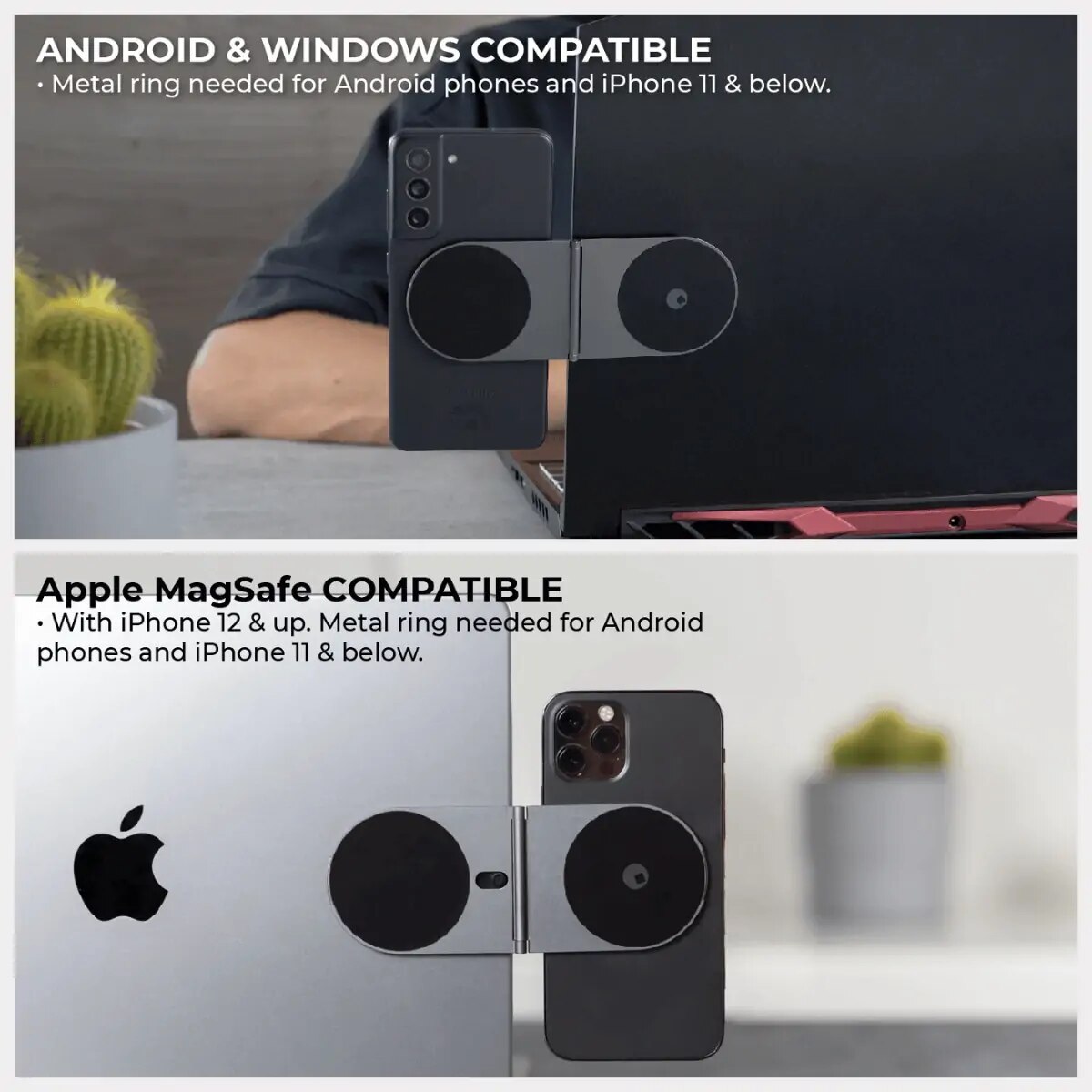 A magnetic mobile stand that helps you attach your phone to your laptop.