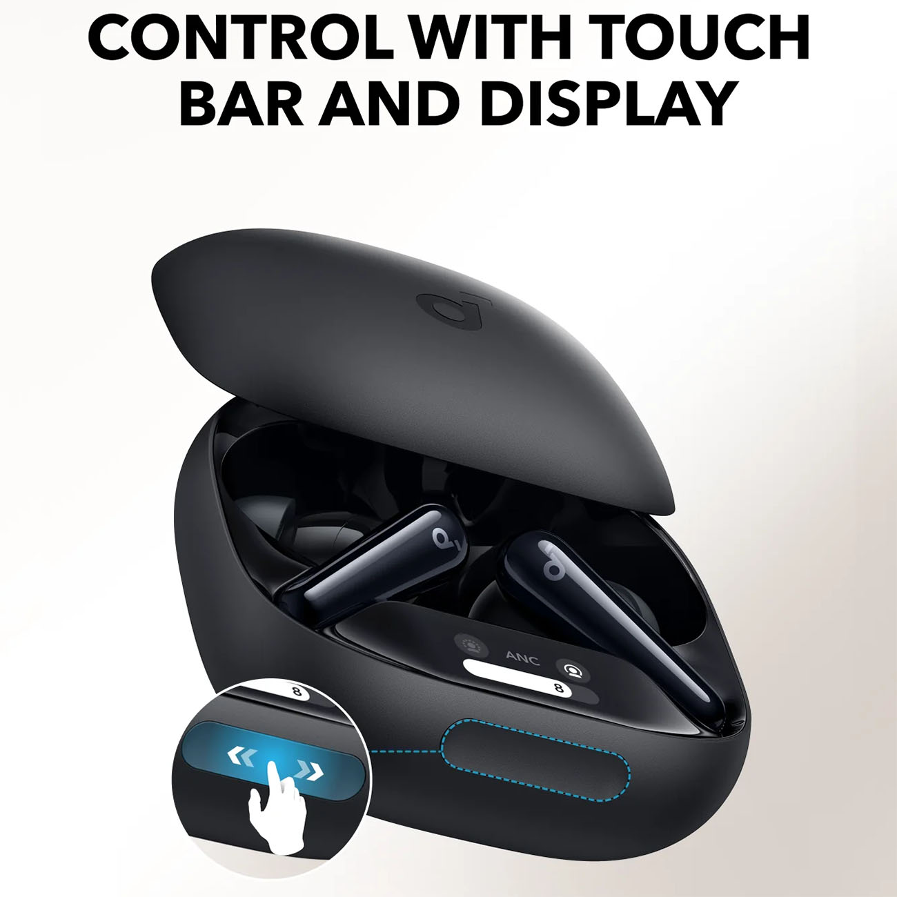 Charging case includes a small display for earbud settings control.