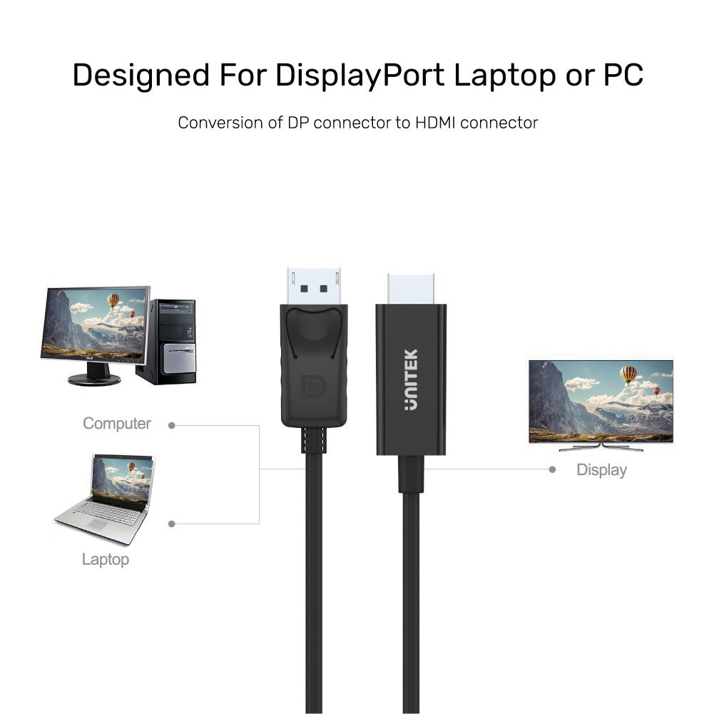This cable adapter helps convert the signal from DisplayPort interface to HDMI. Resolution up to full HD 1920x1200. It allows for audio pass-through if supported by the video source.