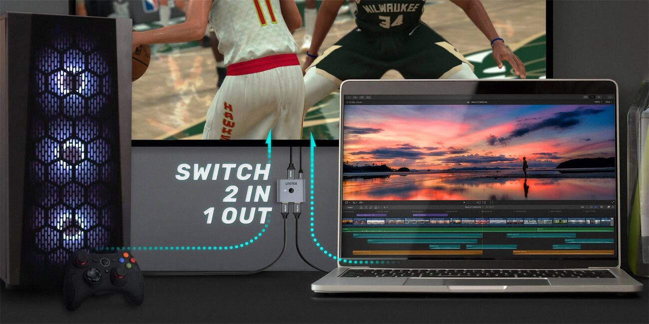 In summary, this device enables you to effortlessly switch between using two monitors or connecting two computers to a single screen. It works with all modern ports and offers excellent performance for the latest high-resolution displays. The one-button switch makes it incredibly user-friendly.