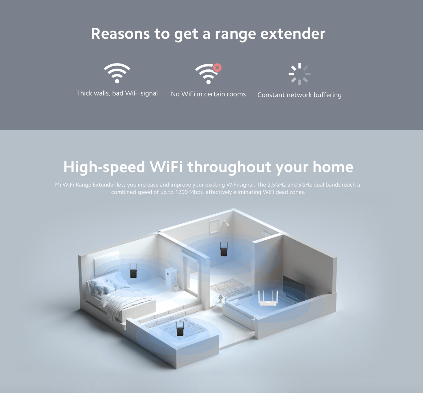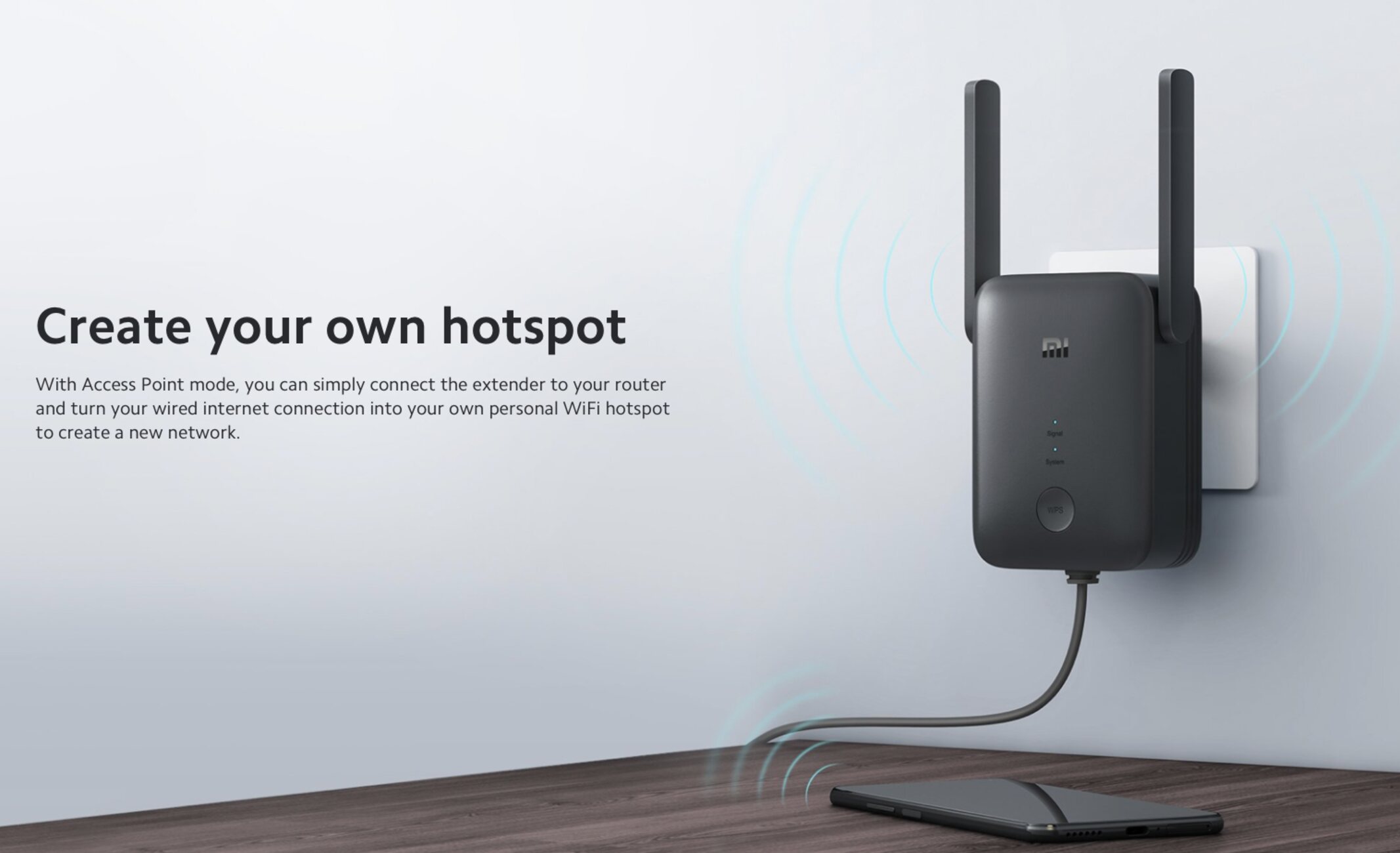 Mi WiFi Range Extender improves and increases existing WiFi signal with dual 2.5GHz and 5GHz bands reaching a combined speed of 1200 Mbps
